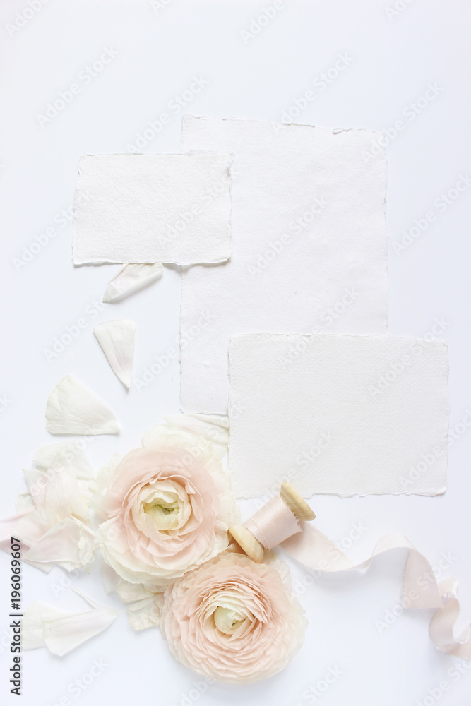 Feminine wedding, birthday desktop mock-up scene. Blank craft paper greeting cards, silk ribbon and blush pink Persian buttercup flowers. White table background. Flat lay, top view.