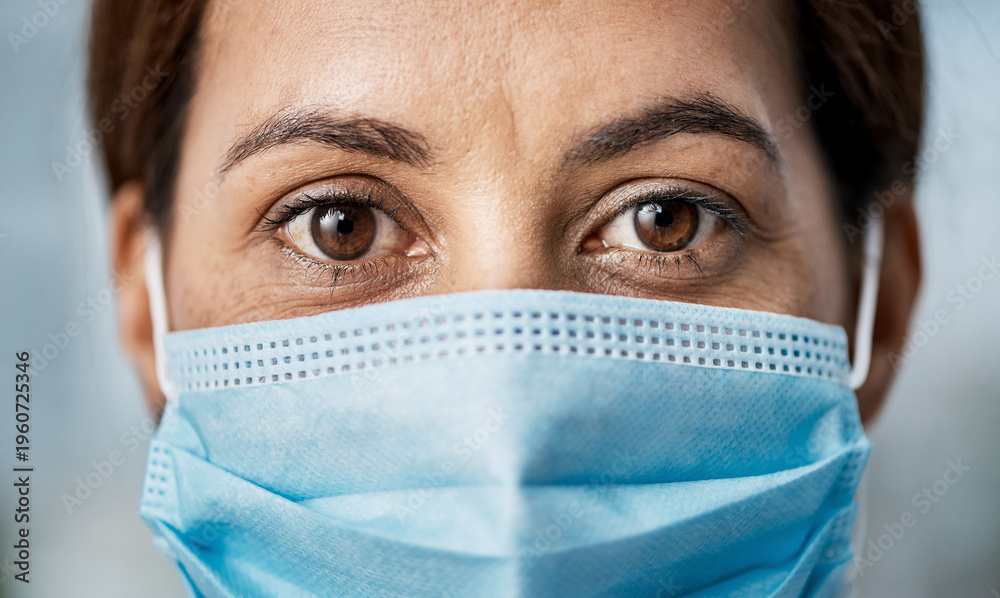 Nurse, safety and woman with mask in closeup for clinic policy, germ prevention or infection control. Healthcare, worker and face cover portrait for hospital protocol, hygiene practice and protection