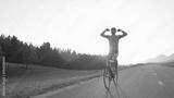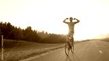 LENS FLARE: Road biker happy to finish challenging race in golden-lit nature.