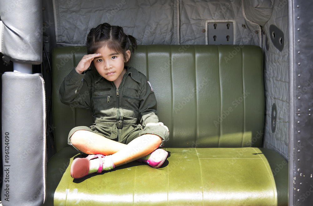 asian girl in respect action with soldier suite sitting on helicopter seat
