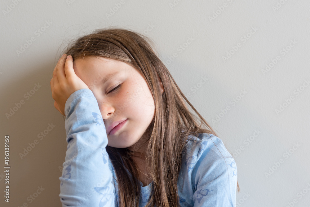 Close up of sad little girl in blue top with eyes closed and hand on head (selective focus)