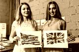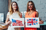 Close-up image of two young women holding a drawing of British and American flags hand-drawn with aquarelle technique on plain paper