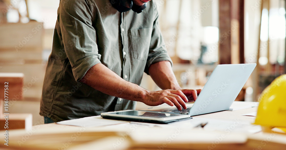 Carpentry, typing or hands with laptop in workshop, creative project or digital planning for craft. Research, furniture inspiration or man with tech for woodworking, check deadline or production info