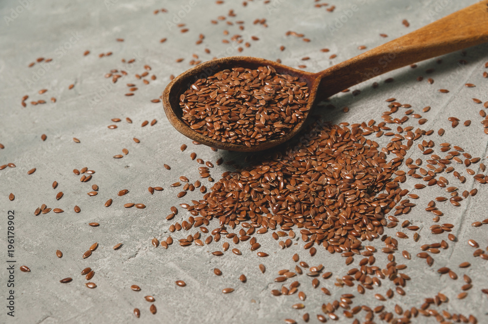 Flax seeds in old wooden brown spoon on gray background. Healthy food.