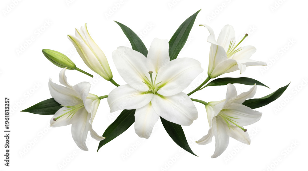 Beautiful white lily flowers and green leaves arranged elegantly, isolated on a transparent background.