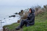 Young woman in grey coat against the autumn sea background