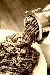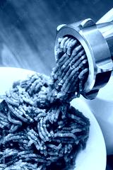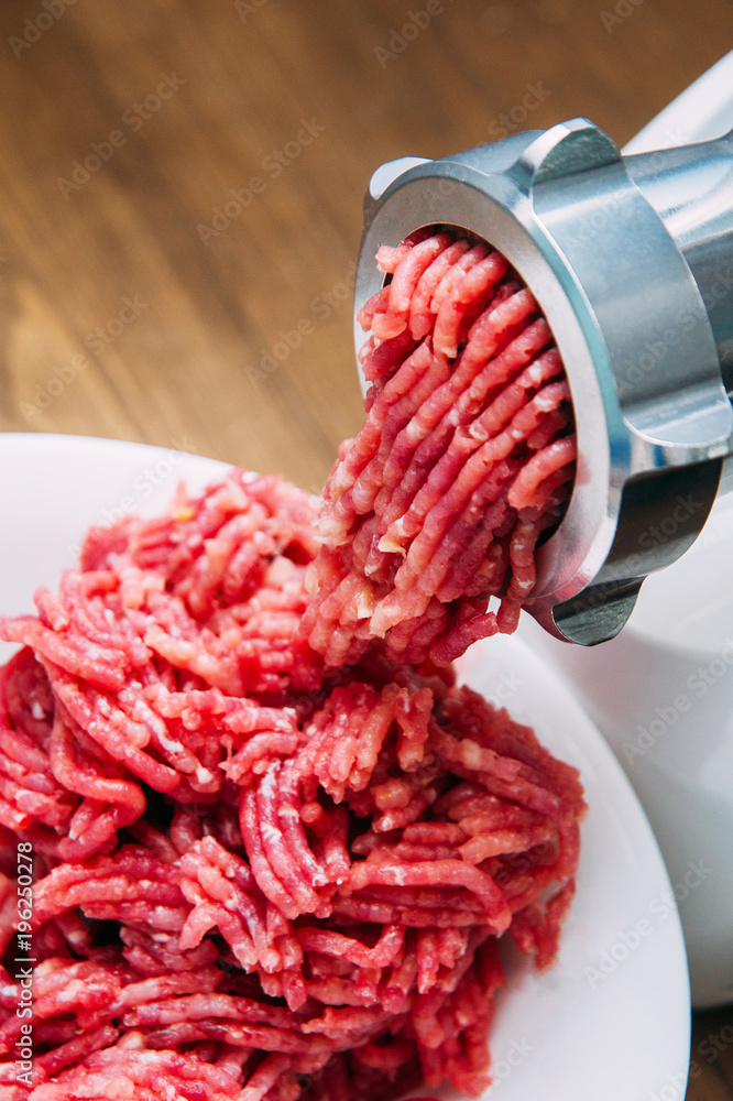 Meat grinder - process of grinding meat. Beef red mince in mincing-machine.