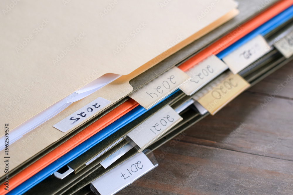Closeup stack of file folders with past year numbers written on tabs. Organized document storage highlighting archiving, record keeping, and chronological filing system