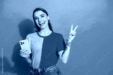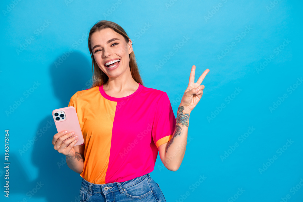 Young woman with colorful tshirt smiling and making a peace sign while holding a smartphone against a bright blue background for lifestyle advertising and shopping