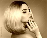 Ombre bob hair woman. Glitter Makeup. Manicure nails. Beauty Portrait of blond model with short shiny hairstyle. Concept Coloring Hair. Fashion jewelry