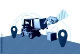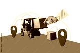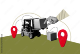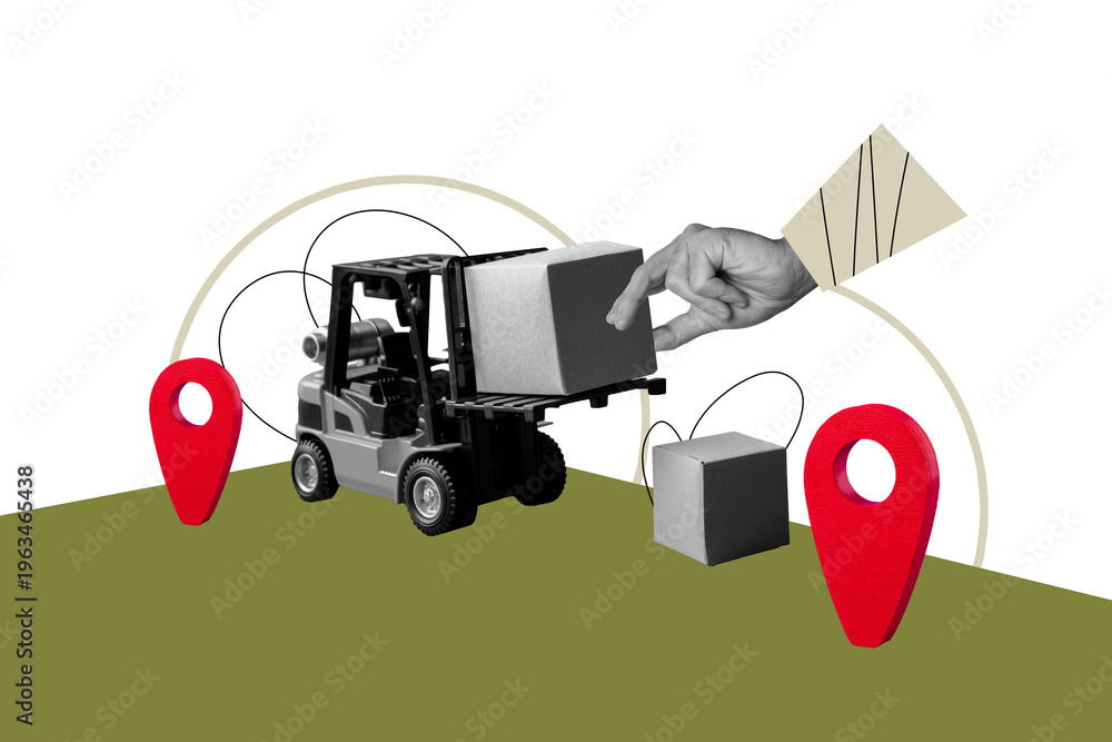Composite photo collage of hand hold box cardboard shipment loader vehicle delivery postal geolocation move isolated on painted background