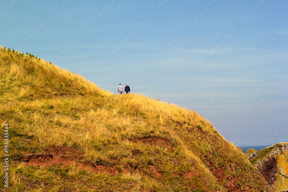 Two tourists walking along beautiful Cliffs of Scotland, St Abb's Head, UK