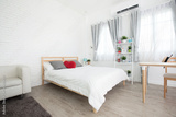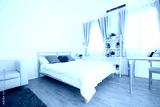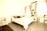 King-size bed in bright bedroom