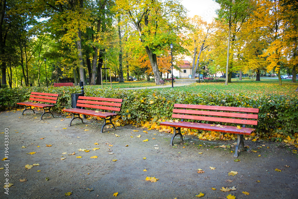 RedThree red, wooden benches in the park in Autum