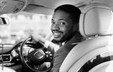Smiling African Car Driver Man Looking At Camera Posing Sitting In New Auto. Selective Focus