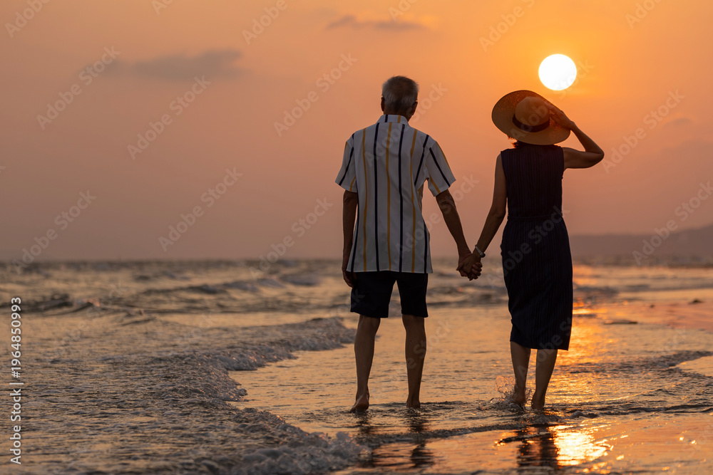 Silhouette of Asian senior couple enjoying their vacation watching at the sunset sea beach in summer for healthy relationship and happy loving marriage life in retirement usage