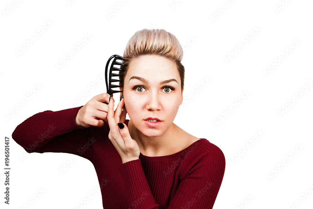 Portrait of beautiful girl with modern hairstyle holding comb nad combing hair. Isolated on white.
