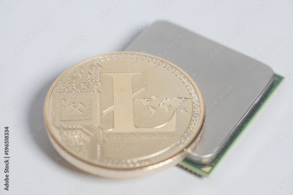 Central processing unit CPU microchip with golden Litecoin