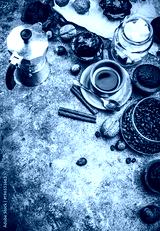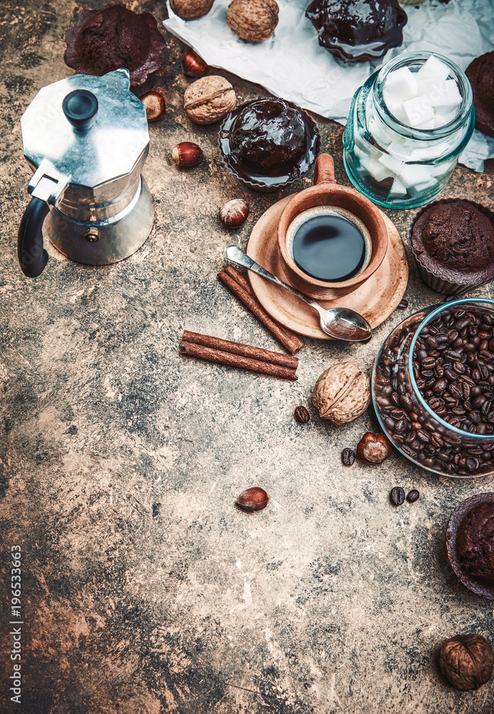 Crafting coffee in clay cup with bean cezve and chocolate cake