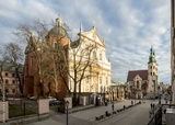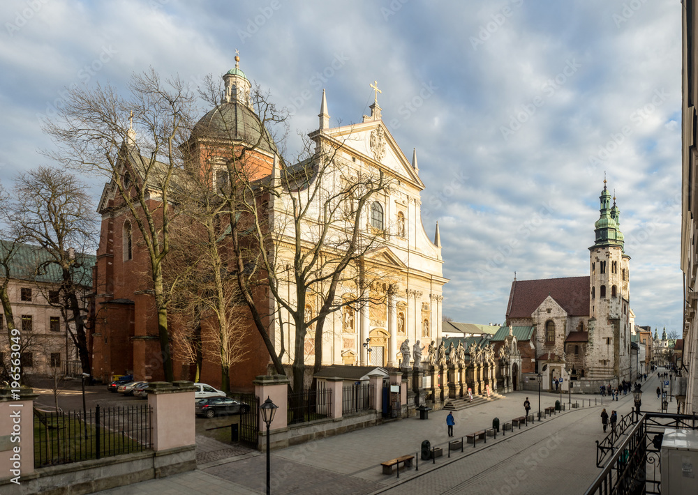 Krakow, Poland. Grodzka Street , Royal Road, with Baroque church of St Peter and Paul (built between 1597-1619, Roman church of St Andrew (built in XI century) and unrecognizable walking people