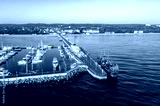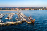 Sopot resort in Poland. Wooden pier (molo) with marina, yachts, pirate tourist ship, beach, vacation infrastructure. Aerial view at sunrise