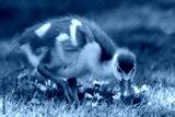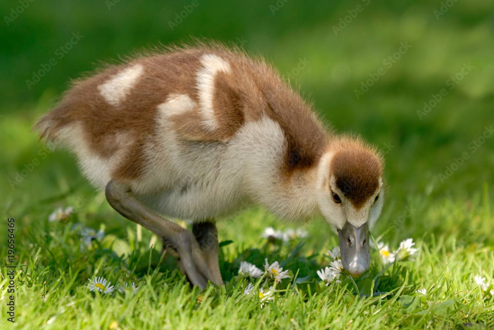 Gänseküken genießt Gänseblümchen