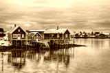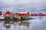 Beautiful winter landscape with traditional Norwegian fishing huts in Lofoten islands