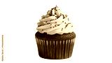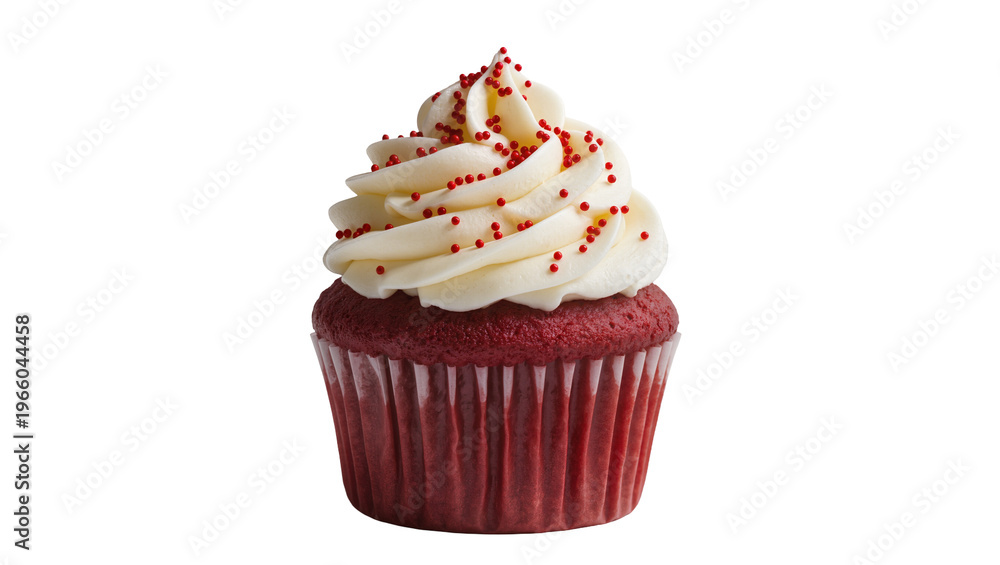 Red velvet cupcake with white frosting and red sprinkles, isolated on transparent background