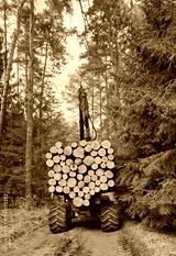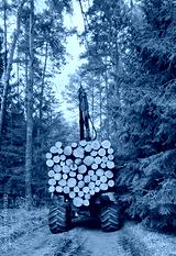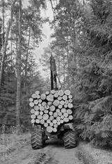 Lumberjack with modern harvester working in a forest. Wood as a source renewable energy.