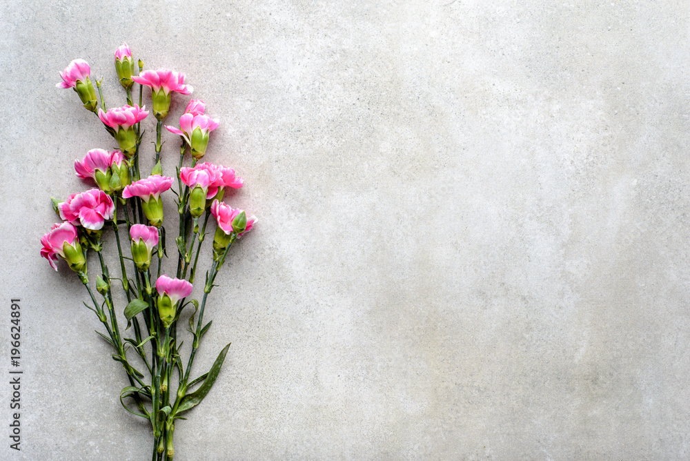 Fresh pink flowers bouquet on gray background, flat lay, top view