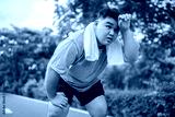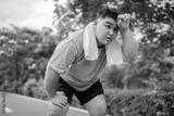 Asian plus-size man taking a break while exercises outdoors in garden.