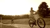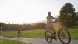 LENS FLARE: Playful girl on cool electric bike overtakes pro rider and waves.