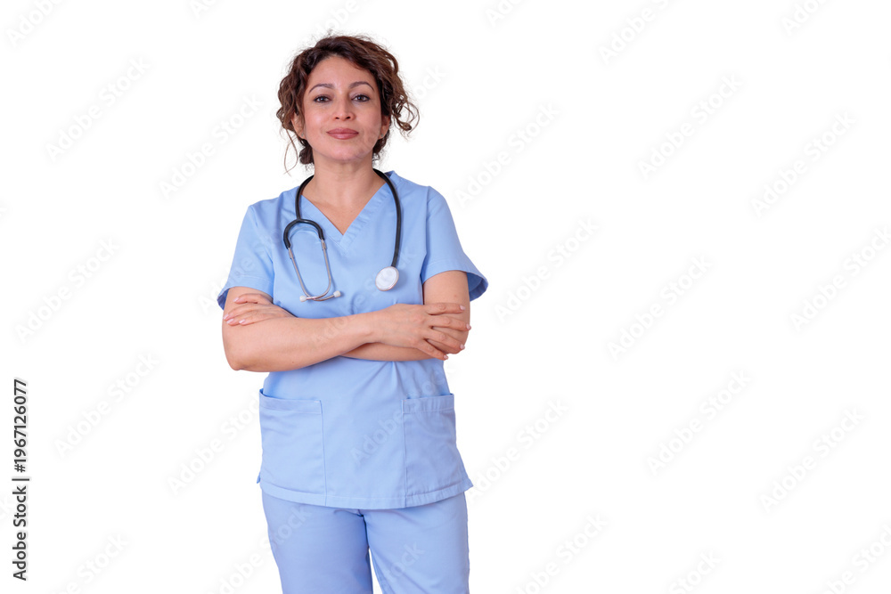 Medical worker or nurse standing confidently in blue scrubs with a stethoscope around her neck, smiling, transparent background