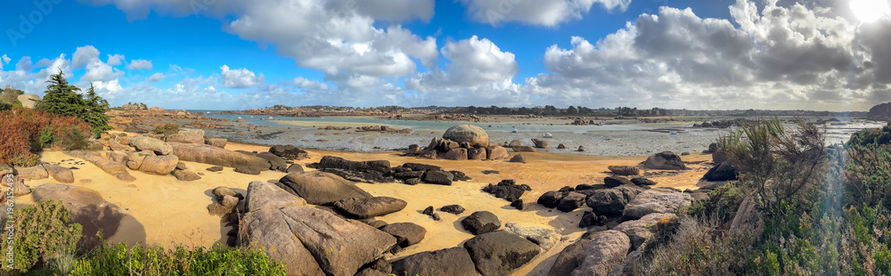 Beach and tidal pools near in Tregastel, Brittany, France. Panoramic view