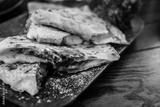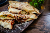 Mexican cuisine. Grilled quesadillas, tortillas with cheese, on wooden board.