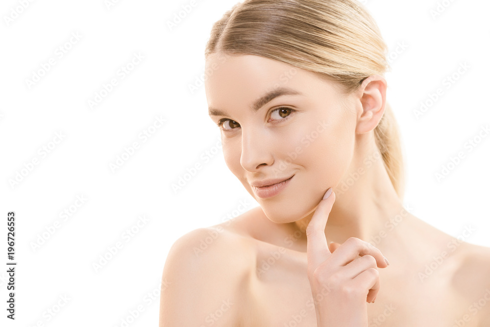 The portrait of the young woman on the white background