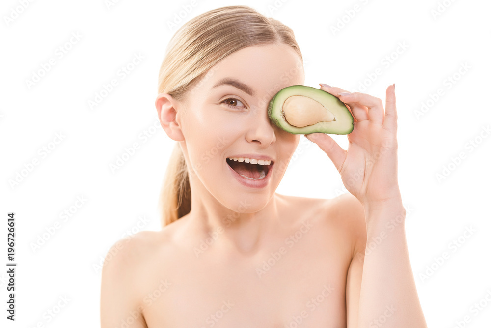 The portrait of the happy woman with an avocado on the white background