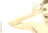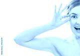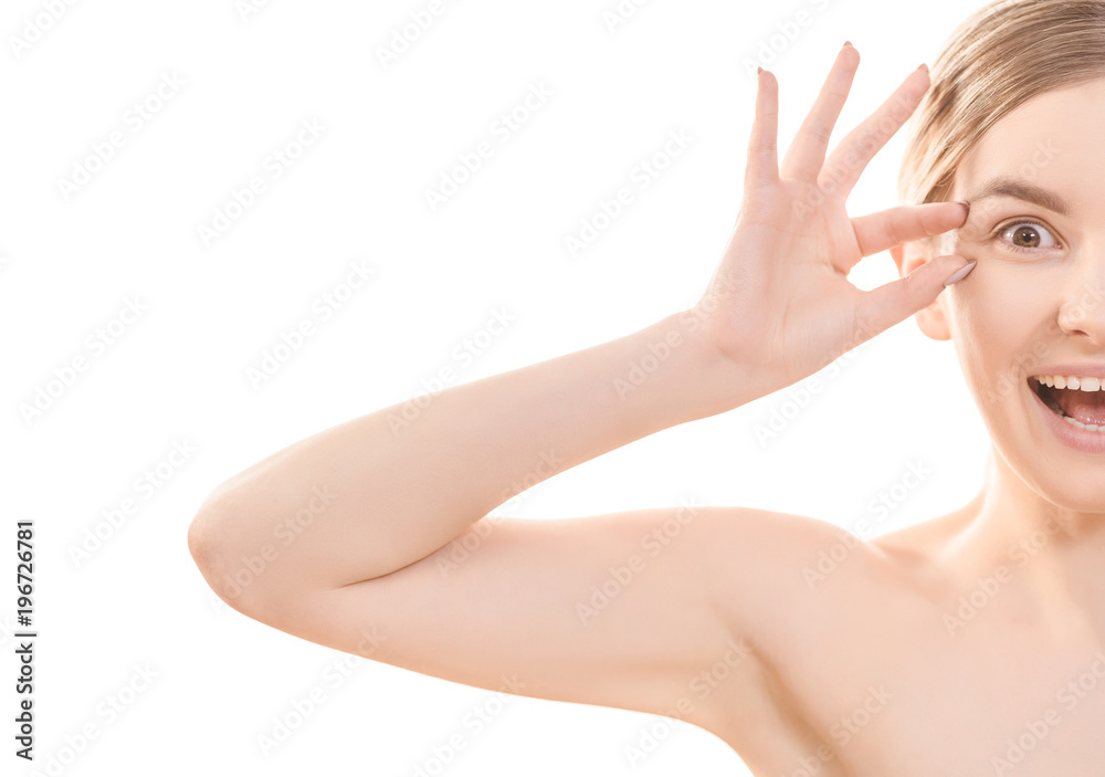 The half of the happy woman face on the white background