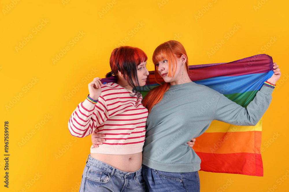 Lovely lesbian couple with rainbow flag on yellow background. LGBT concept