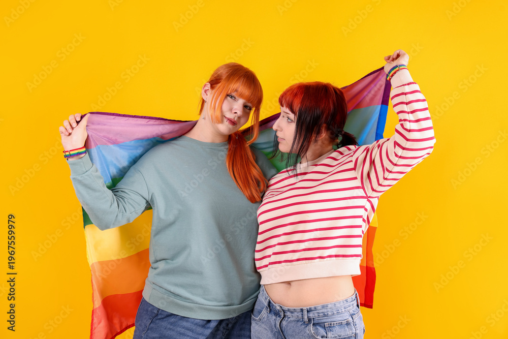 Lovely lesbian couple with rainbow flag on yellow background. LGBT concept