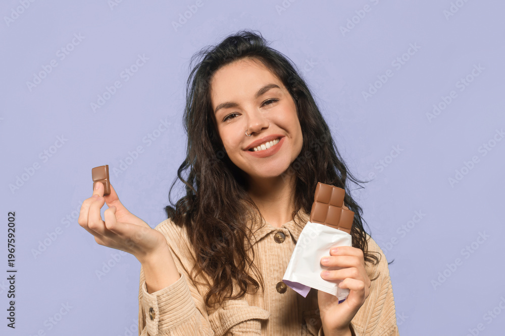 A woman stands against a plain background while holding chocolate bars. She smiles happily as she shows a piece of chocolate in one hand and a wrapper in the other.