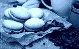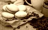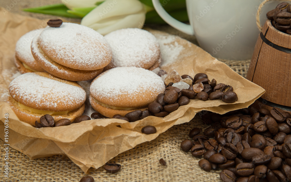 spring still-life from a cup of coffee with milk, biscuits, a bouquet of white tulips on a rough background