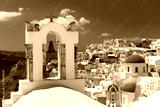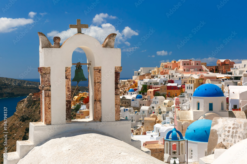 Arch with a bell, white houses and church with blue domes in Oia or Ia, island Santorini, Greece