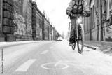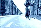 A snow-capped bike path and a partial view of a cyclist