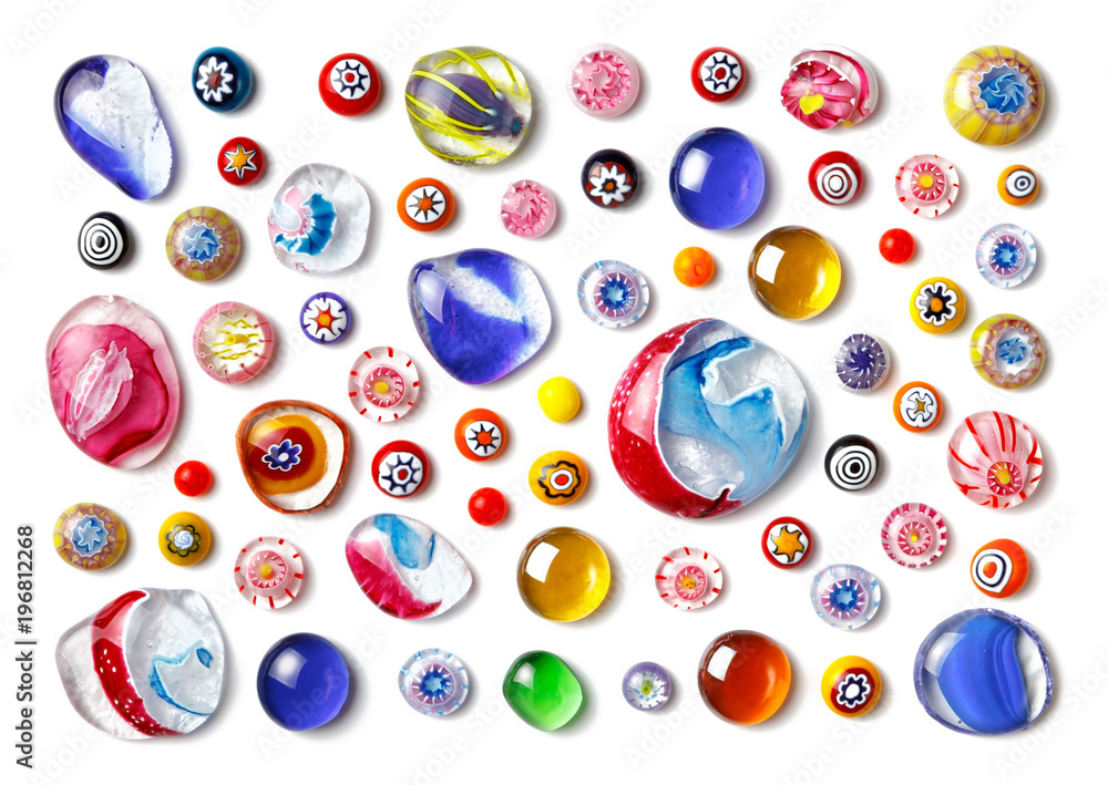 Collection of colorful glass beads of different sizes and shapes. Colored Venetian, Murano glass, millefiori. Flat lay, top view