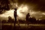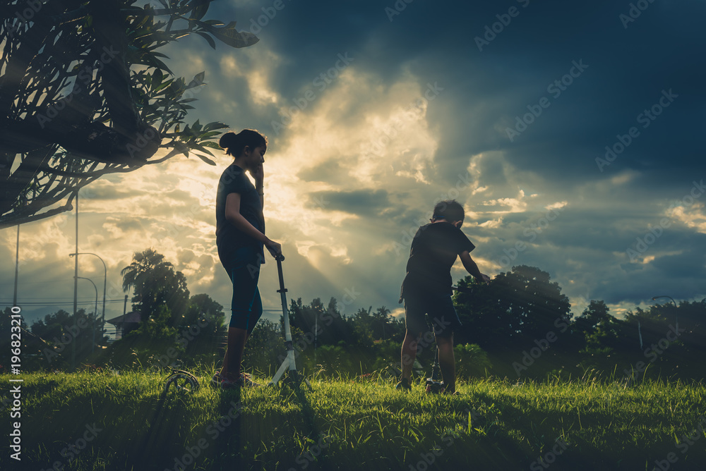 Asian boy and girl playing scooter field.