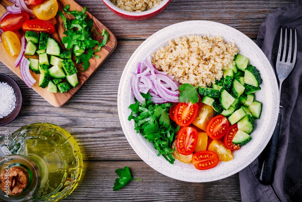 Healthy Quinoa Tabbouleh Salad bowl with fresh cucumbers, tomatoes and red onions