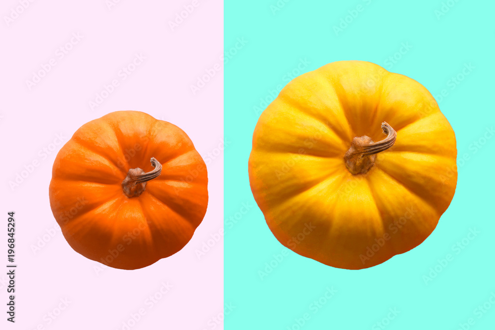 two orange isolated pumpkin for Halloween or thanksgiving day on colorful blue and pink vintage background