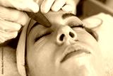 A professional esthetician wearing gloves uses a green jade gua sha stone to massage the forehead of a relaxed female client during a skin rejuvenation treatment at a wellness clinic.