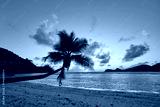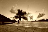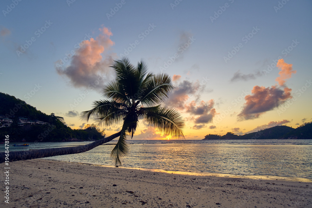 coconut palm tree on beach Baie Lazare during sunset, seychelles